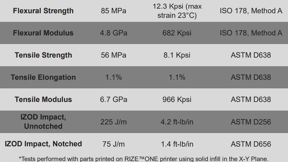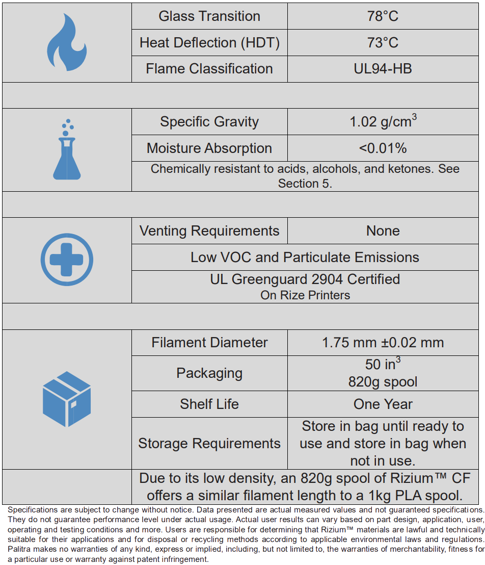 Rizium™ Carbon Fiber is an advanced engineering-grade filament designed specifically for FFF 3D printing. Through its Cyclic Olefin Coplymer blend with Carbon Fiber, it provides high throughput, hassle free 3D printing creating parts that have stunning visual finish, close to isotropic properties, very low moisture absorption, excellent chemical resistances, and certified printing safety.